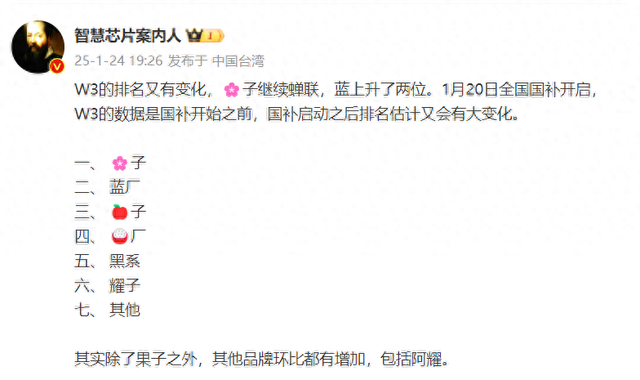 这不在1月24日行业人士“智慧芯片案内人”就带来了2025年W3周的排名,需要说明的是这恰恰是国补前一周的数据,因为国补是从1月20日开始的。根据他提供的数据这一周华为继续在国内市场称王,印象之中这应该是华为连续四五周在国内排名第一了。排名第二的是vivo,排名第三的是苹果,排名第四的是小米,排名第五的是OPPO,排名第六的是荣耀。在给出数据的同时他表示,这一周的排名有了新变化,华为继续蝉联,vivo上升了两位。而且在本周只有苹果一家环比是下降的,其它上榜的五个品牌一丝全部都有所增长。